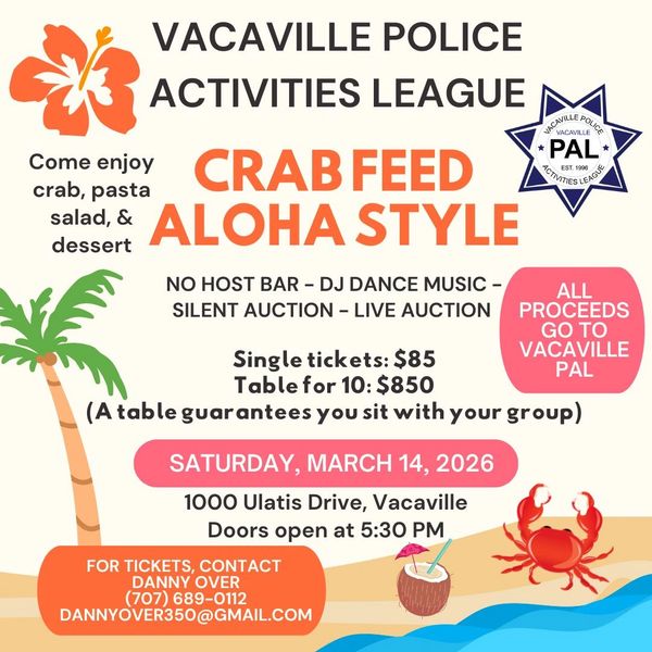 The Vacaville PAL board is committed to the well-being of our young people and works diligently to raise funds to ensure programs continue. Vacaville PAL's success is achieved through community partnerships where our community leaders and businesses invest in our youth. One such opportunity is through the annual crab feed. Each year, this sold-out event is attended by over 400 people. Join us this year!